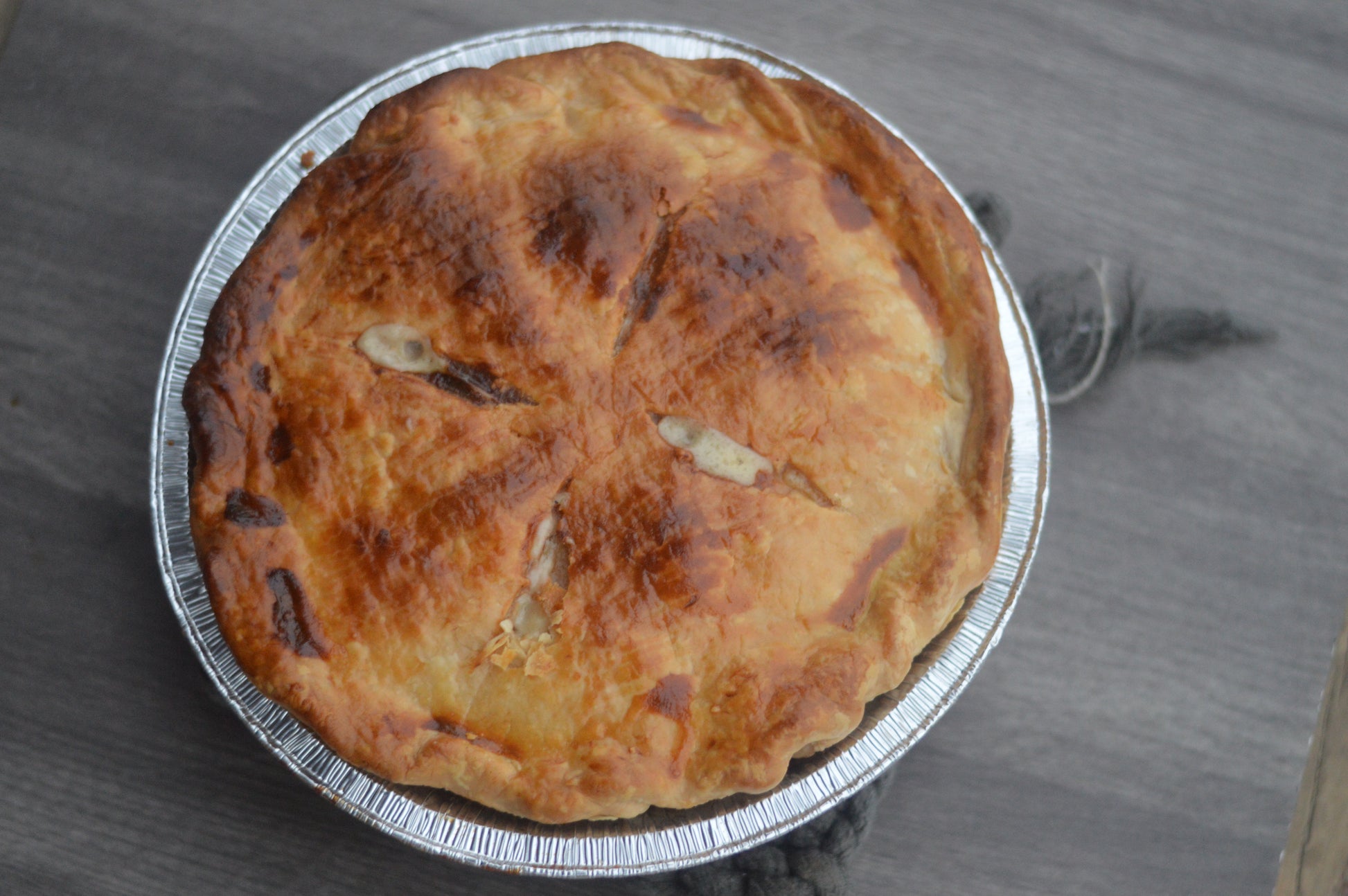 pie crust on top and bottom with a creamy homemade chicken filling. The pie will be unbaked- thaw and bake in oven.